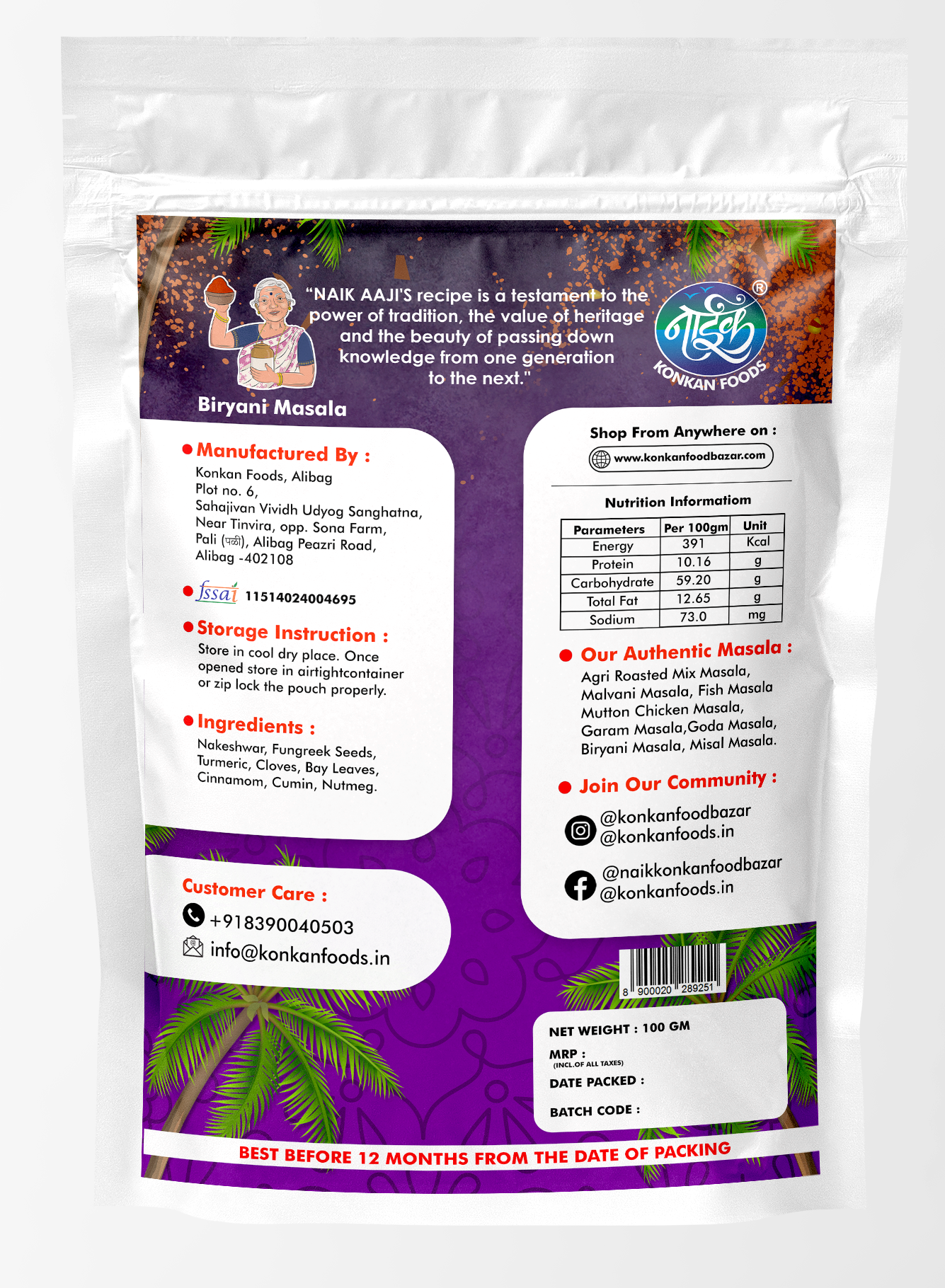 Crafted from Naik Aaji's traditional Konkani recipe, our Biryani Masala is a blend of aromatic spices that will elevate your biryani to perfection. Expertly curated for maximum flavor, it guarantees an authentic and delicious biryani experience every time. Impress your family and friends with this secret ingredient.