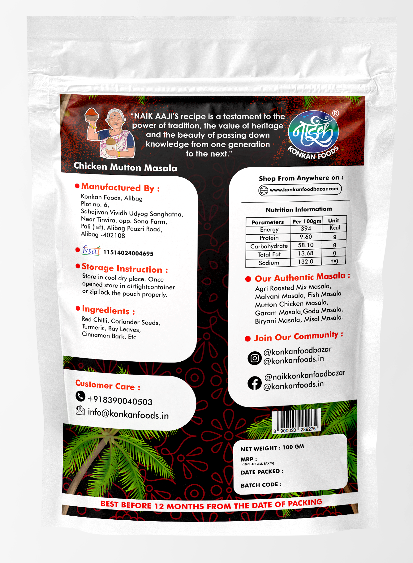 This traditional Konkani Chicken-Mutton Masala is made with Naik Aajis' authentic recipe. Enjoy the flavorful blend of spices that enhances the taste of both chicken and mutton. Indulge in this delicious dish that brings the taste of India to your kitchen. Made with the finest ingredients, this masala will elevate your cooking to the next level.